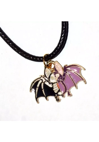 Quirky little half skeleton enamel bat necklace on an 18 inch black leather look cord. The perfect accessory for a gothic look or spooky Halloween season or cosplay!